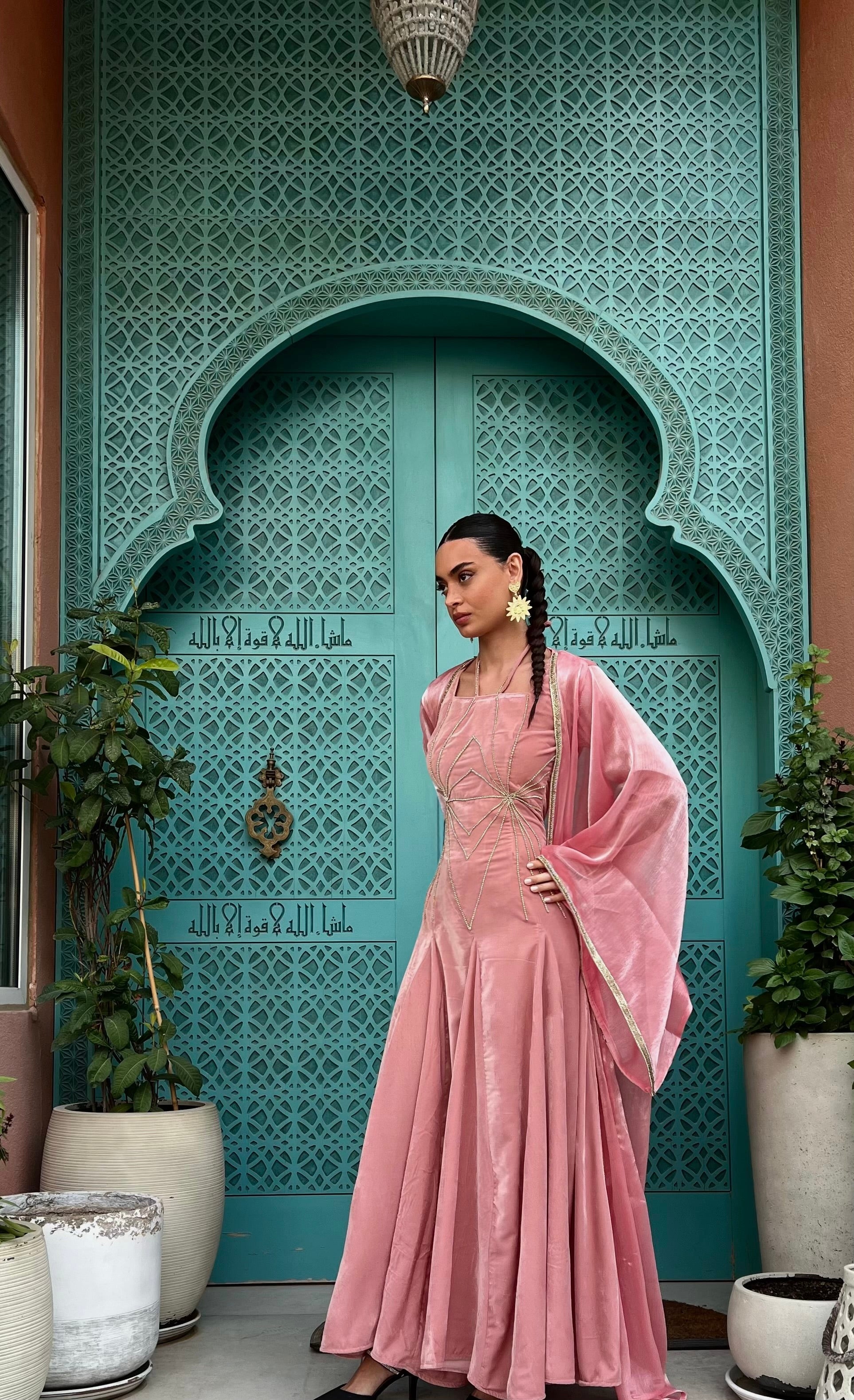 A soft cloud pink dress with a flowing, elegant shape. Lina is detailed with fine gold lines that add a gentle touch of shine. Light, graceful, and easy to wear, it’s perfect for Ramadan, evening gatherings, and special moments.