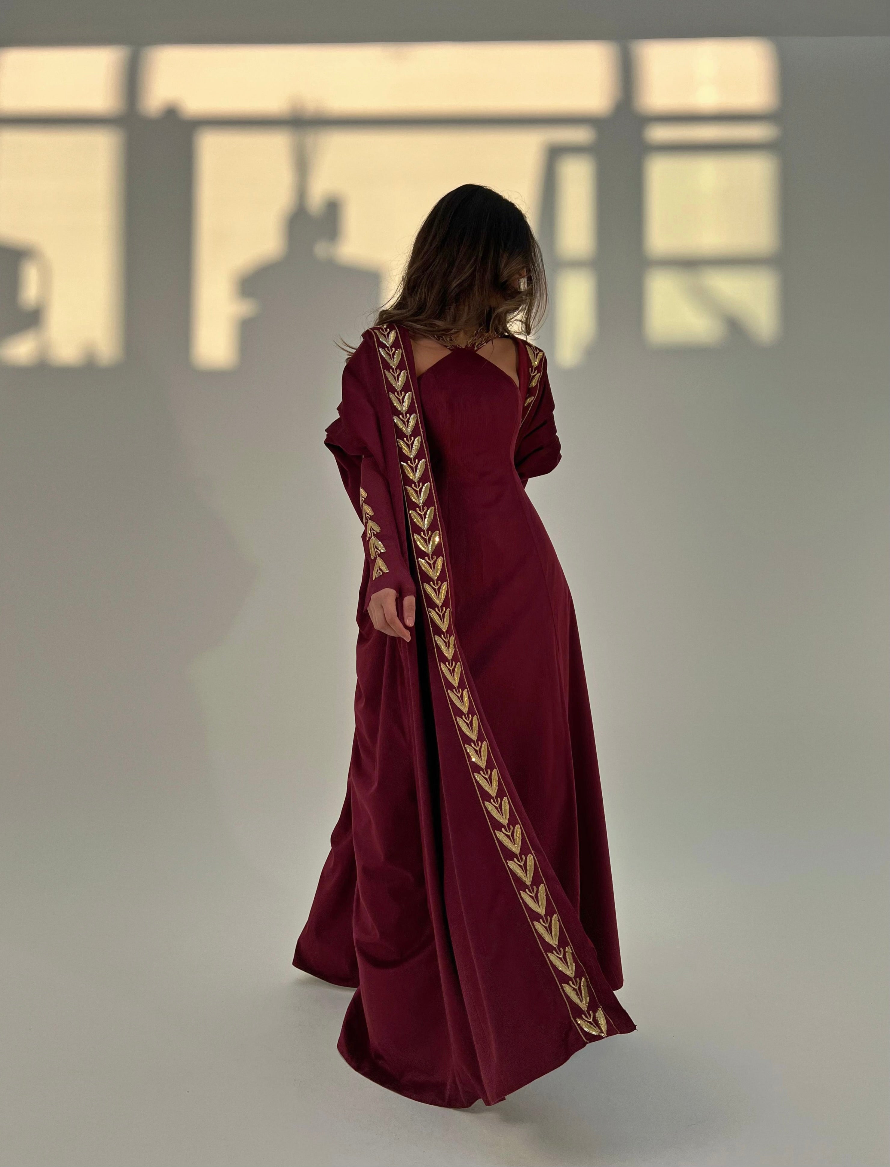 The deep burgundy shade adds depth and sophistication — perfect for special occasions and elegant evening wear.