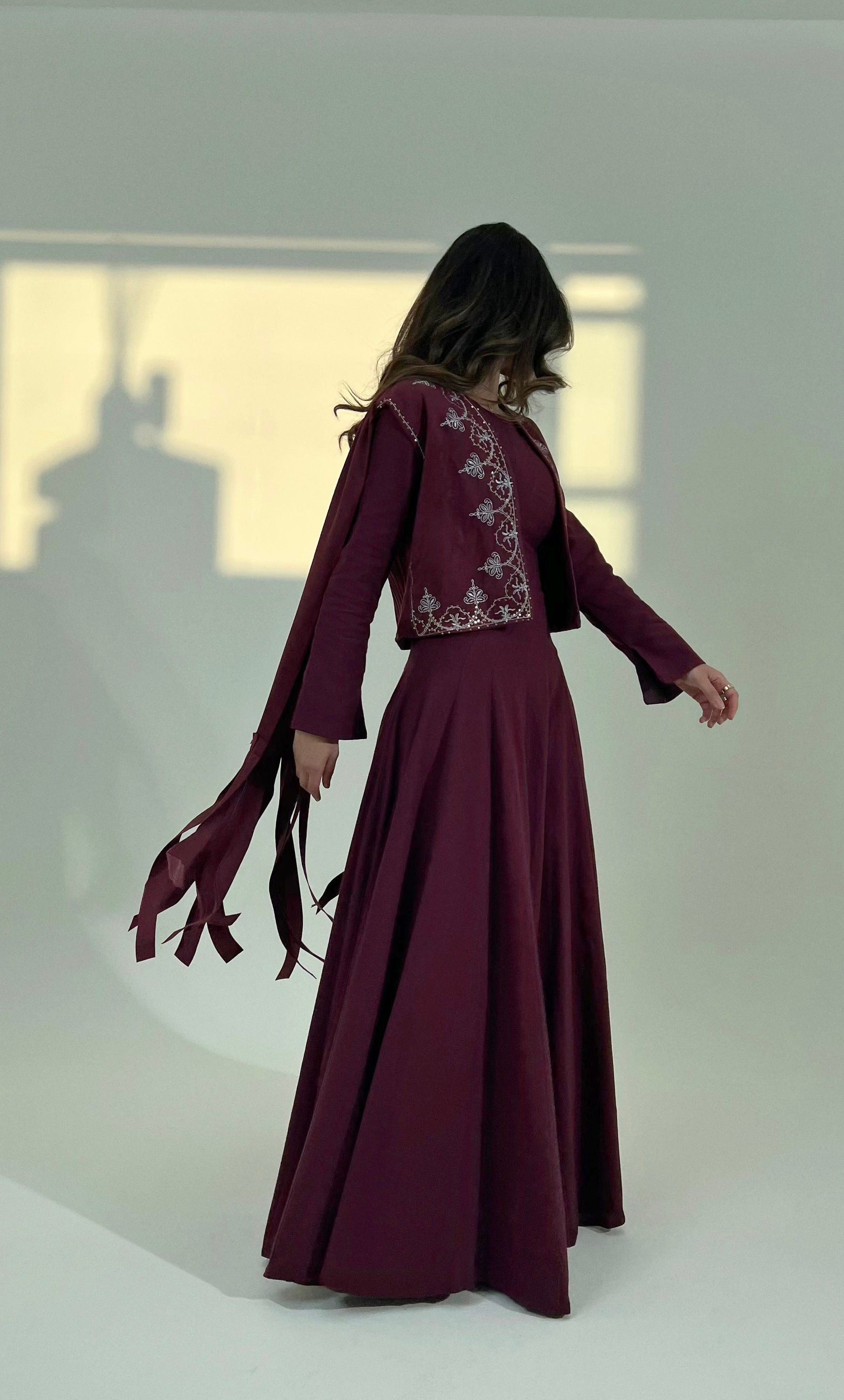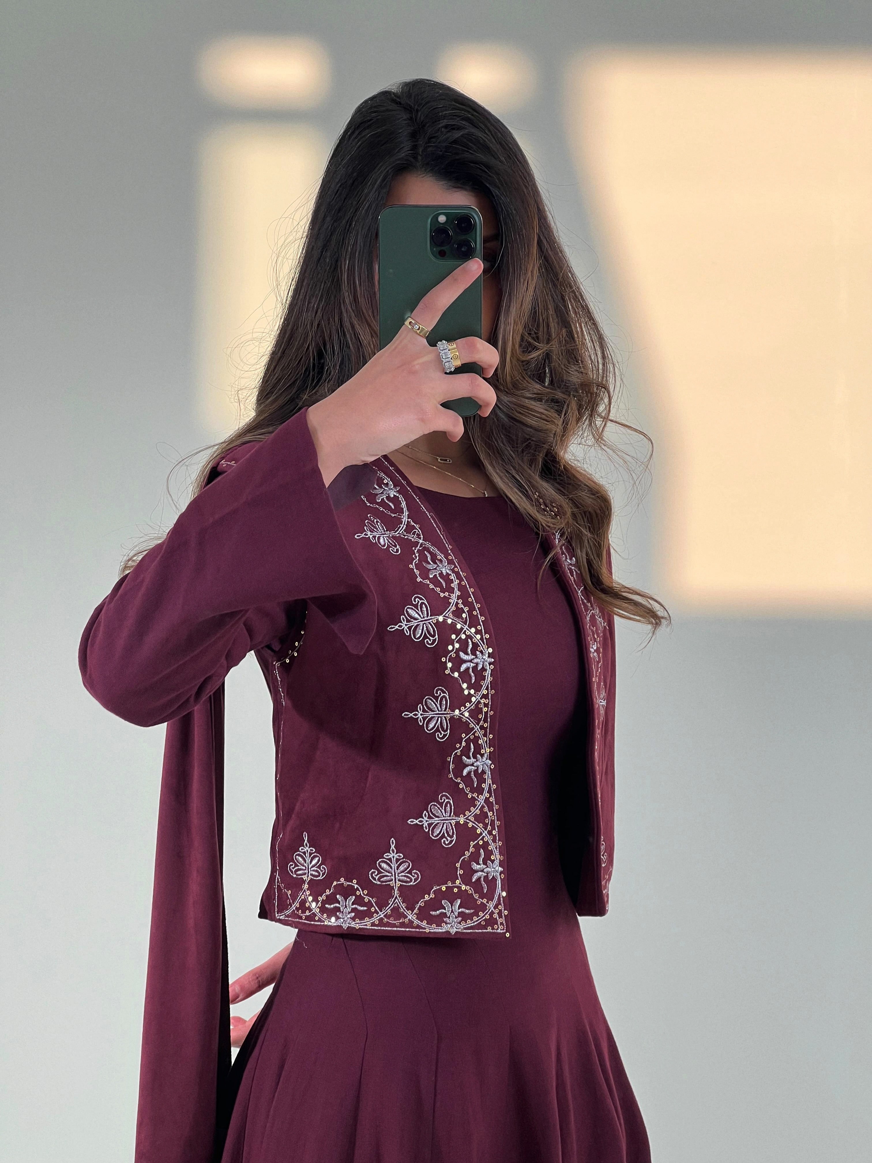 This two-piece design features a flowing dress paired with a beautifully embroidered jacket, adding depth and character to the silhouette. The rich burgundy shade brings a sense of warmth and sophistication, making it a timeless choice for special occasions, festive gatherings, or elegant evenings.